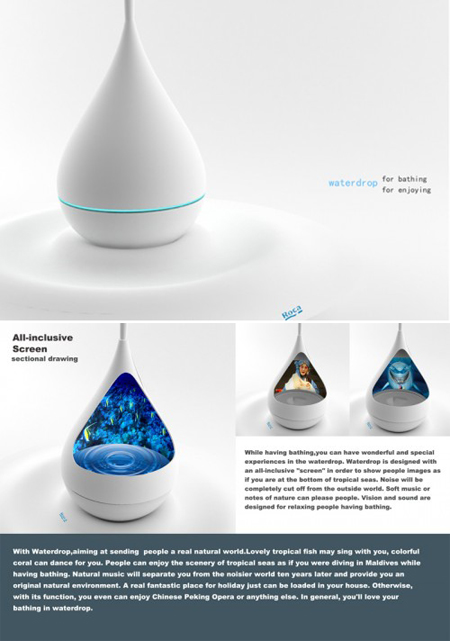 沐浴在“水滴”之中,可爱的热带鱼与你共浴,多彩的珊瑚为你伴舞,美妙的音乐为你带来远离尘嚣的宁静,甚至可以享受中国京剧等各种各样的节目,有助于消除身心疲惫。如此惬意的设计,出自浙江大学城市学院艺术设计专业吴成厚同学之手,日前作品成功入围第三届乐家国际设计大赛10强。该作品“waterdrop shower room”(水滴浴室)以普通的水滴为原型,充分发挥设计思维,采用完美的线条设计,打造出精美的未来浴室,旨在带给人们一个轻松真实的自然世界。